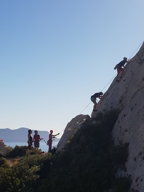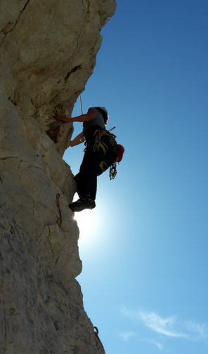 Wir tasten uns langsam aber sicher an die neue Umgebung heran. Wir lernen den Umgang mit den verschiedenen Sicherungsgeräten üben den Standplatzbau, das Klettern im Top-Rop, die Standardbewegung und das Klettern in der Mehrseillängenroute in drei Stärke Klassen vom Einsteiger bis zum Profi.