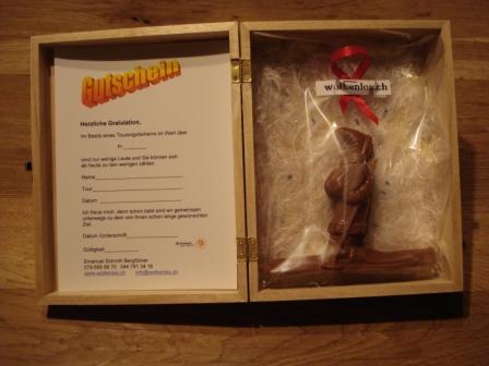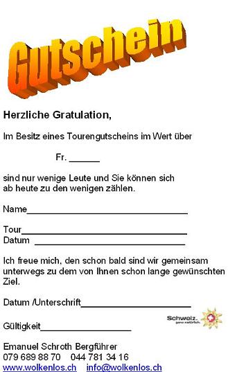 via E-Mmail an info@wolkenlos.ch oder Natel 0041 79 / 689 88 70 und hier kann man den Gutschein als PDF runterladen